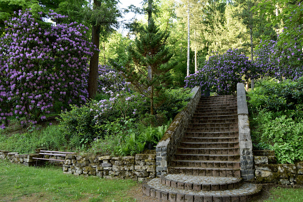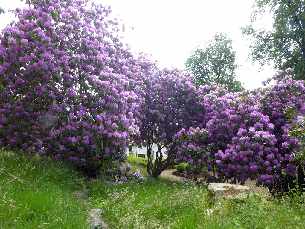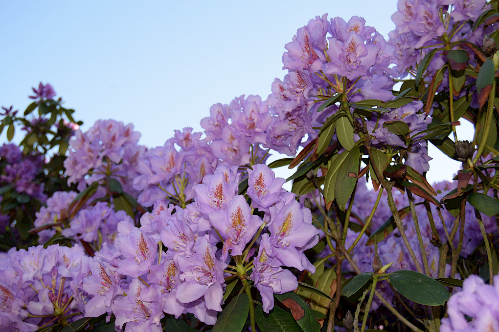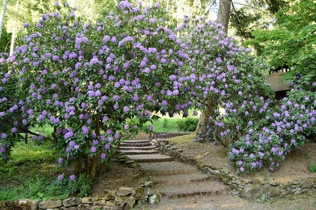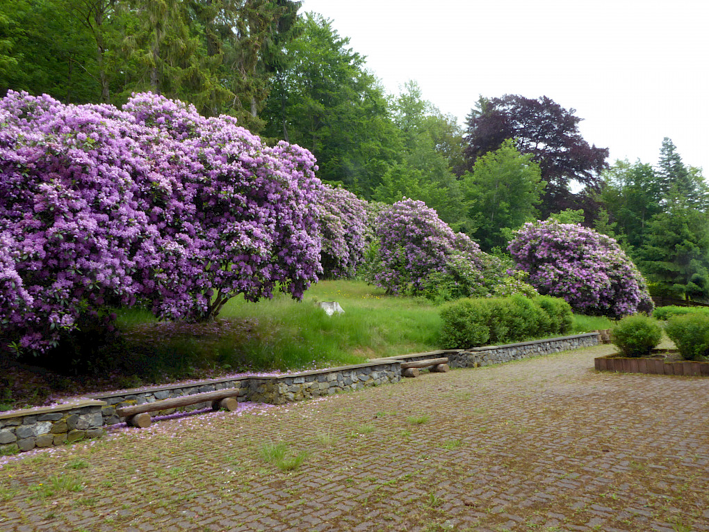 Die "alten" Rhododendron sind inzwischen zu ansehnlichen Exemplaren von 4 Metern und mehr herangewachsen. Gepflanzt wurden die damals üblichen Sorten "Catawbiense Grandiflorum", die den größten Umfang ausmachen. Weiterhin die Sorten "Cunningham's White", "Roseum Elegans", Catawbiense Boursault" und "Fastuosum Flore Pleno". Vereinzelt findet man noch "Album Novum" und "Nova Zembla".
