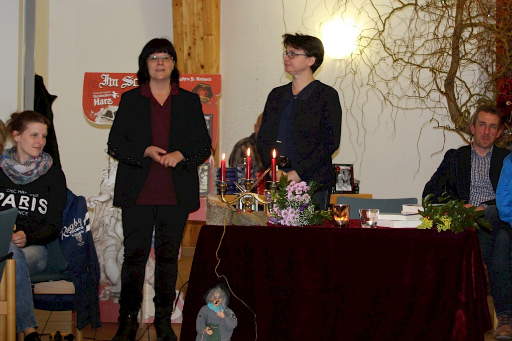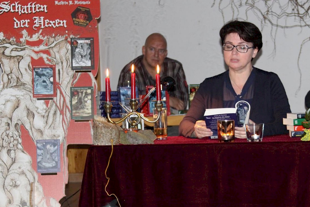 Frau Hotowetz erzählte von ihrer ersten selbst geschriebenen Geschichte in ihrer Kindheit, in der schon damals eine Hexe vorkam, von ihrer Liebe zum Harz und seinen verwunschenen Plätzen, die schon vor Urzeiten den einstigen Bewohnern als Ritualplätze dienten. Wie aus Überlieferungen bekannt, gab es damals schon weise Frauen, die sich mit Heilkunst und allerlei Kräutern auskannten, die aber einen zwielichtigen Ruf hatten, da man ihnen nachsagte, mit dem Teufel im Bunde zu sein. Wir kennen sie alle, die Geschichten von den Verleumdungen und Hexenverbrennungen, die die "Weißen Frauen" auch in ihren Büchern auszustehen hatten. Ebenfalls erfuhren die Zuhörer, wie ihr eigenes Anwesen, die fast 800 Jahre alte "Geistmühle am See" in Halberstadt zur Quelle ihrer Inspiration beitrug.