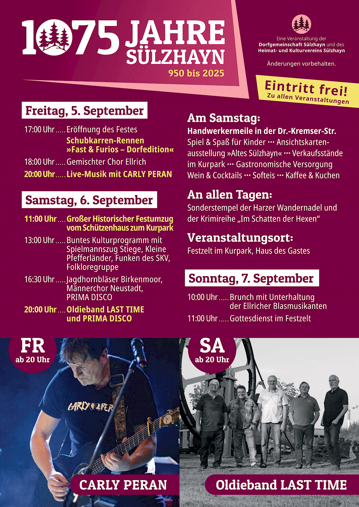 Drei tolle Tage sind anlässlich unseres 1075. Dorfjubiläums vom 5. bis 7. September geplant. Bitte beachten Sie die kurzfristigen Programm-Änderungen und Ergänzungen unter folgendem Link https://www.heimat-kulturverein.de/1075-jahre-suelzhayn/programm-zur-1075-jahrfeier-in-sulzhayn-vom-5-bis-7-september-2025