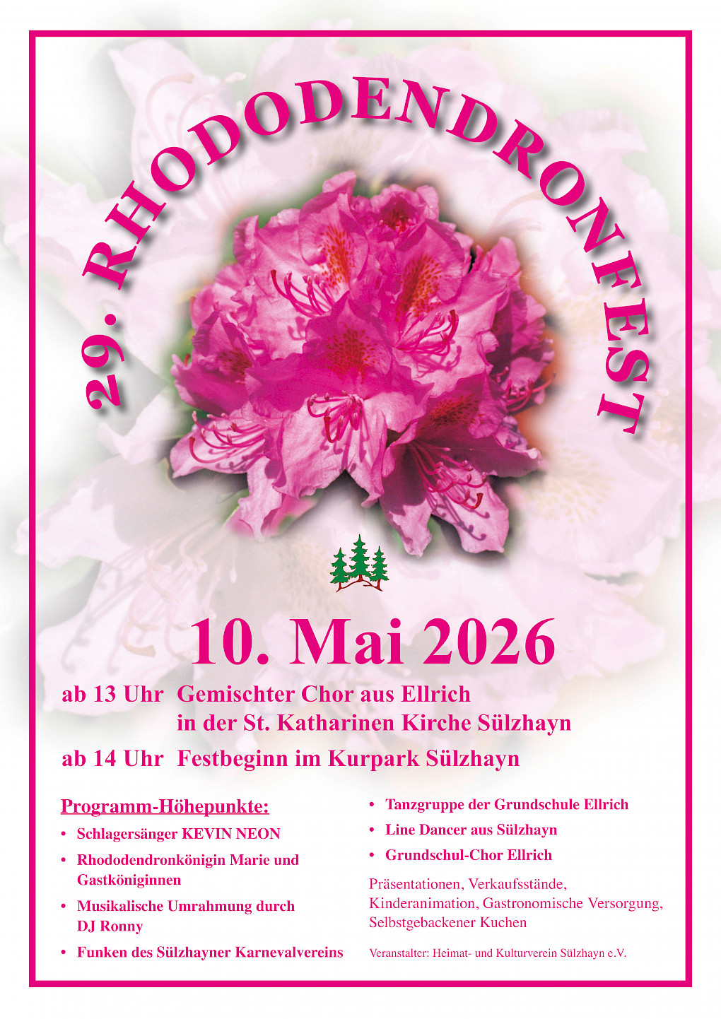 Am Sonntag, den 10. Mai 2026, verwandelt sich der Sülzhayner Kurpark wieder in ein farbenfrohes Festgelände – denn die Rhododendren stehen hoffentlich in voller Blüte und laden zum Feiern ein! Der Heimat- und Kulturverein heißt alle Gäste herzlich willkommen, gemeinsam einen unvergesslichen Frühlingstag zu erleben.