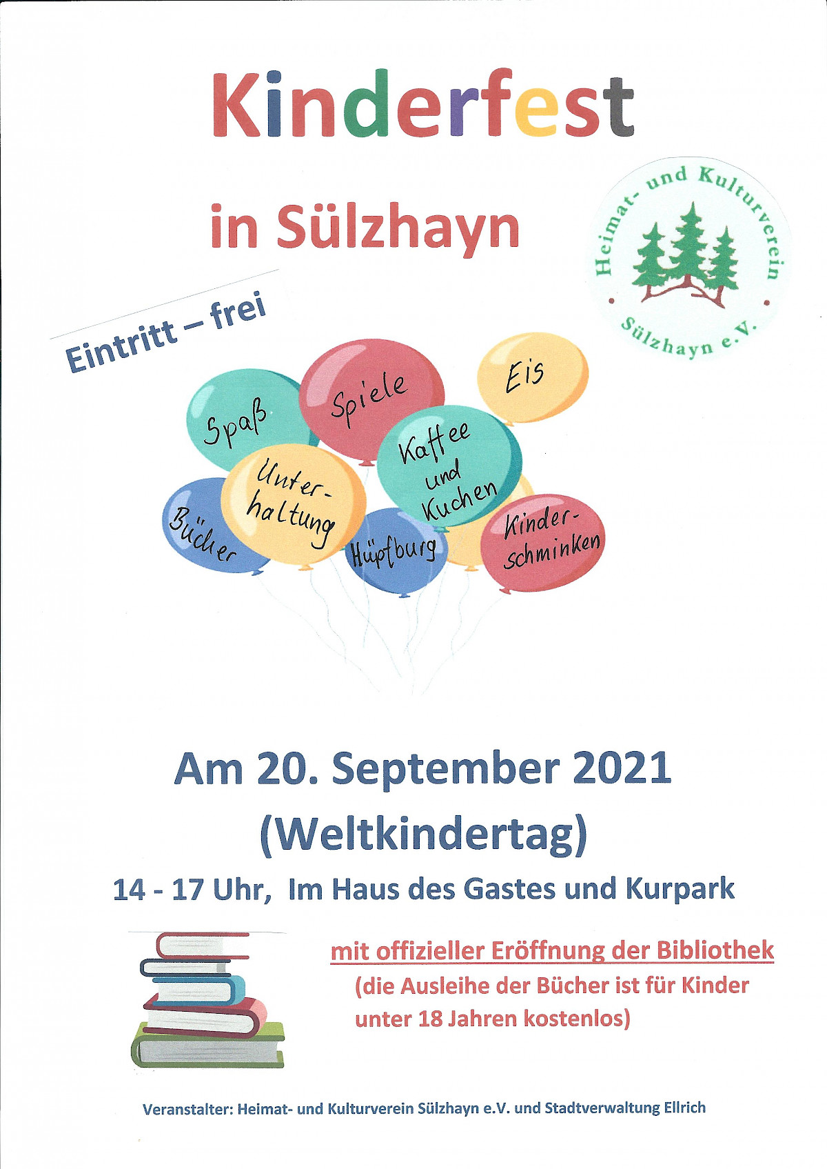 Am Weltkindertag, dem 20. September 2021, wird in Sülzhayn gefeiert! An diesem Tag, in der Zeit von 14 - 17 Uhr, eröffnet der Heimat- und Kulturverein die Sülzhayner Bibliothek mit einem Kinderfest.